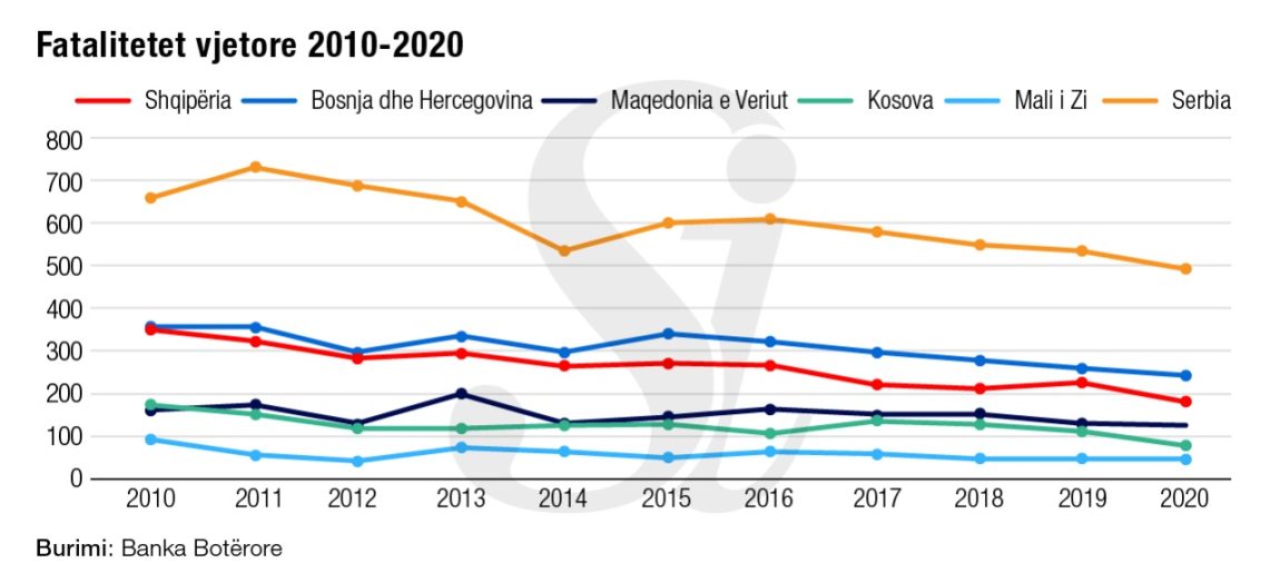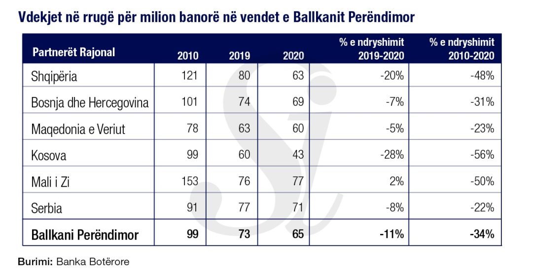 Të gjitha vendet e Ballkanit Perëndimor kanë pasur rënie të aksidenteve viktimave nga aksidentet rrugore për 10 vitet e raportuara nga BB, përveç Malit të Zi dhe Maqedonisë së Veriut që kanë pasur të njëjtat shifra para dhe gjatë pandemisë.