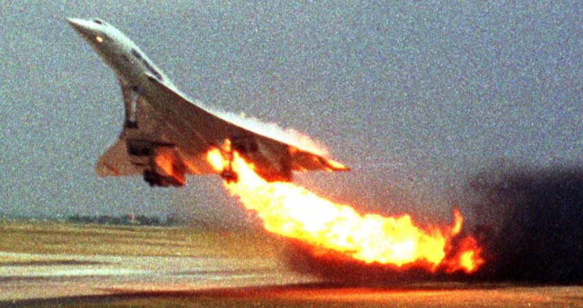 Ndërsa po ngrihej, rrotat e tij u përplasën në pistë me një shirit prej aliazh titaniumi që kishte rënë nga një aeroplan i Continental Airlines, i cili ishte ngritur pak më parë.