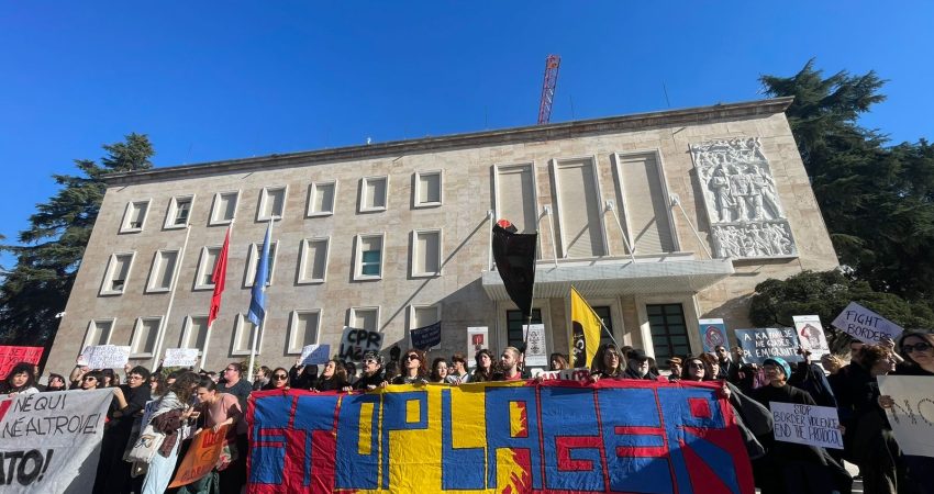 Nga Gazeta Si- Aktivistë të shoqërisë civile nga Italia dhe Shqipëria janë bërë bashkë në një protestë para Kryeministrisë kundër marrëveshjes së Italisë dhe Shqipërisë për të vendosur emigrantët e vendeve të treta në një kamp në Gjadër. Protesta vjen teksa marrëveshja është e ngrirë dhe kampi është pothuajse i boshatisur.