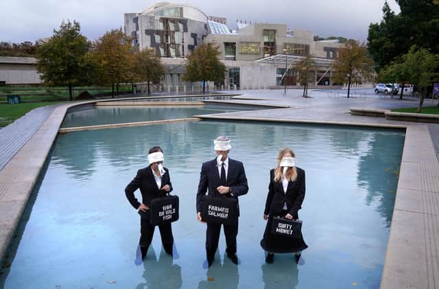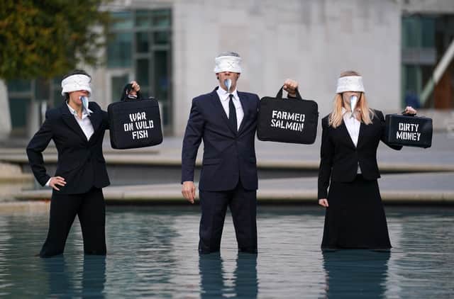 Aktivistët kanë mbajtur një protestë jashtë Parlamentit Skocez me sy të lidhur dhe në gojë me peshq të ngordhur për të nënvizuar “tragjedinë mjedisore” të peshkimit të salmonit.