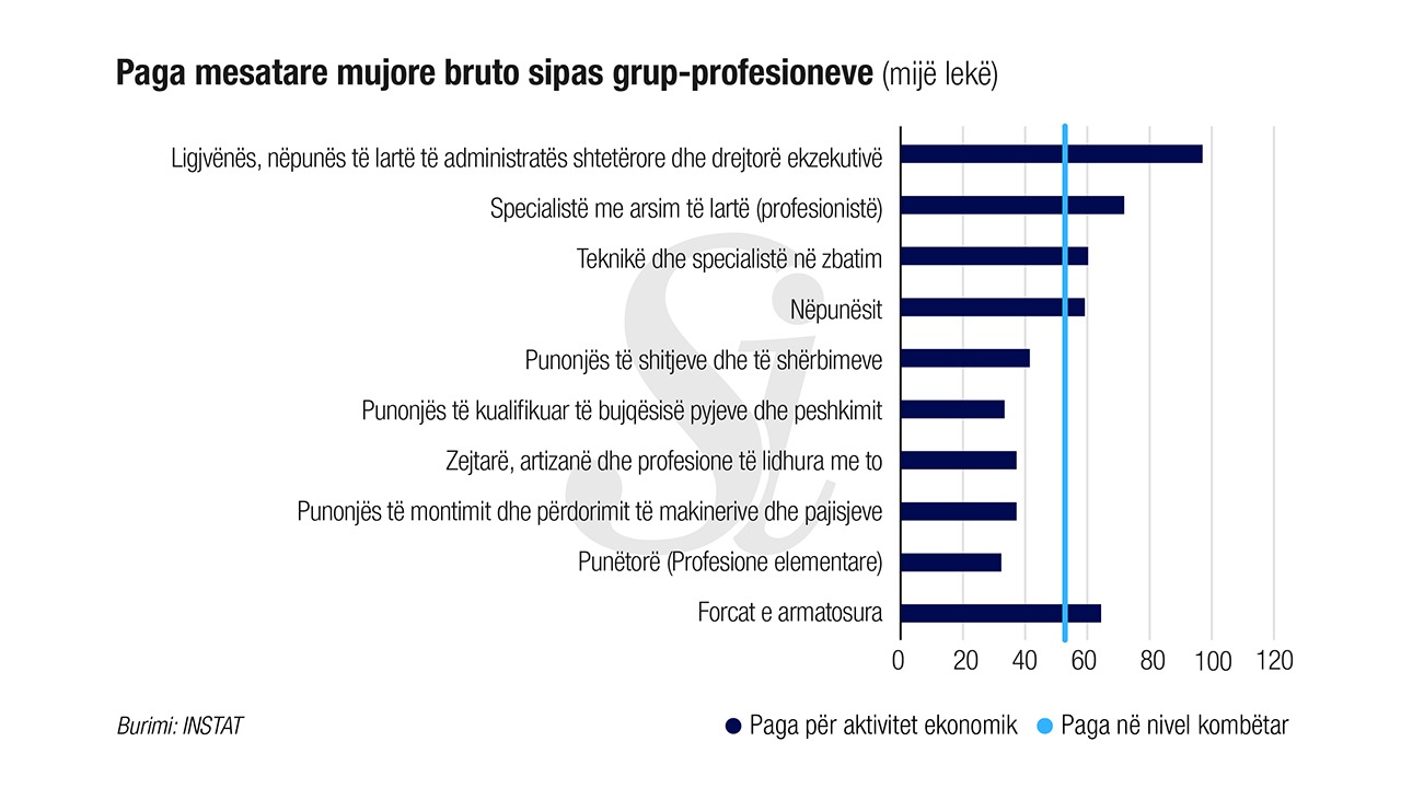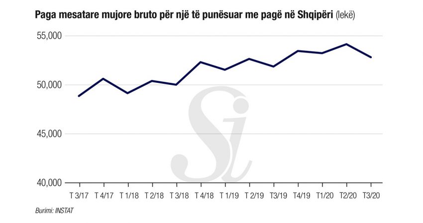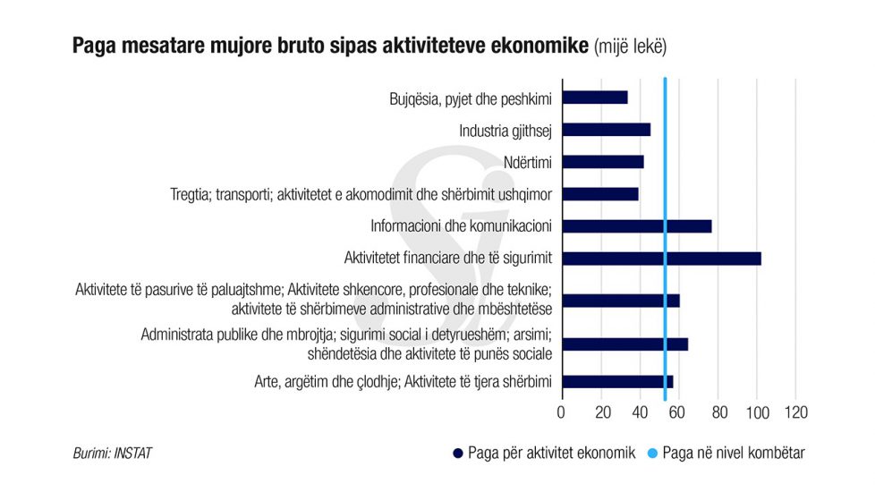 Sipas INSTAT, gjatë tremujorit të tretë 2020, paga mesatare mujore bruto për një të punësuar me pagë në sektorin e aktiviteteve financiare dhe të sigurimit është 93,6 % më e lartë sesa mesatarja në nivel kombëtar, ndërsa në grup-aktivitetin e Bujqësi, pyje dhe peshkim është 36,6 % më e ulët. Krahasuar me të njëjtin tremujor të vitit të kaluar, gjatë tremujorit të tretë 2020 paga mesatare bruto për grup-aktivitetin e Aktivitete të pasurive të paluajtshme; Aktivitete shkencore, profesionale dhe teknike; Aktivitete të shërbimeve administrative dhe mbështetëse, ka rritjen më të madhe prej 4,3 %, ndërsa Bujqësia, pyjet dhe peshkimi ka një ulje prej 8 %.