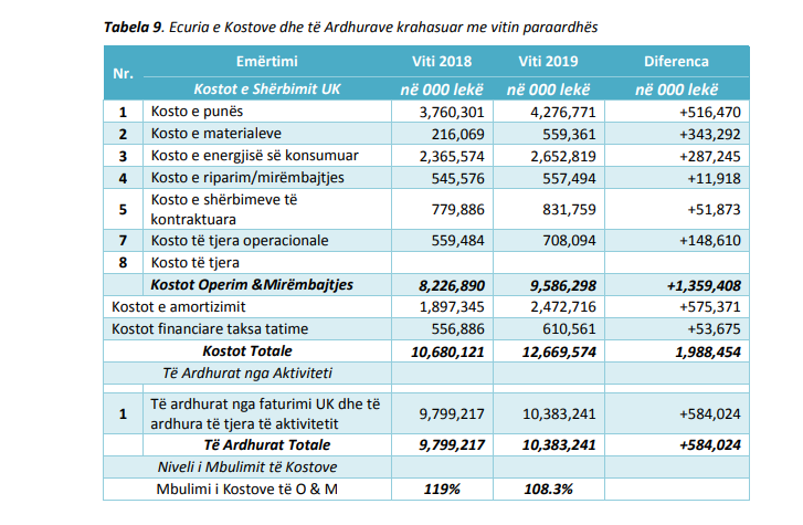 Nga tabela e mësipërme vërehet se Sektori për vitin 2019 e ka zhvilluar aktivitetin e tij duke shënuar një rritje të konsiderueshme të kostove të operimit dhe mirëmbajtjes me rreth 1.3 miliard lekë në një kohë që të ardhurat janë rritur me 584 milion lekë. Kjo ka sjell dhe një rënie në mbulimin e kostove të operimit dhe të mirëmbajtjes..