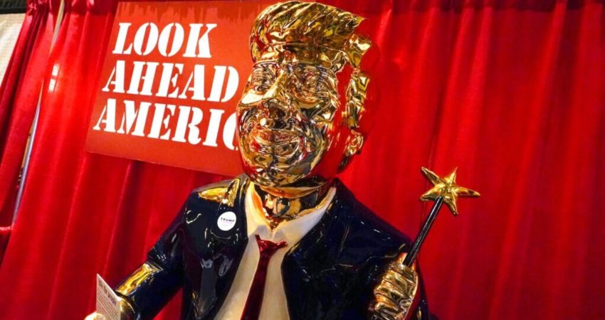 Në rastin se do të kishte ndonjë dyshim se CPAC i këtij viti i ishte kushtuar zotit Trump, statuja e ish-presidentit, e veshur me një xhaketë blu, kravatë të kuqe dhe pantallona boksi ngjyrë të kuqe, të bardhë dhe blu, ishte shfaqur në vendin e konferencës.