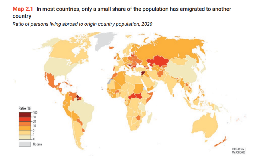 Në hartën botërore të emigrantëve në raport me popullsinë, Shqipëria ngjyroset me të kuqe, që përfshi fashën 20-30%.