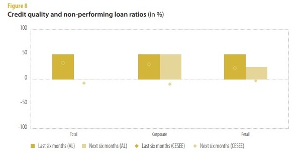 Të gjithë segmentet pasqyruan ecuri pozitive përveç kredisë në monedhë të huaj. Kushtet e ofertës së kredisë (duke treguar gatishmërinë e bankave për të dhënë kredi për klientët e tyre) janë shtrënguar dhe pritet të shtrëngohen më tej, ndërkohë që tendenca rajonale është neutrale.