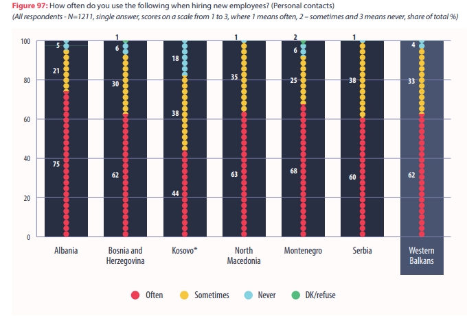Një pyetësor i ngjashëm është kryer edhe me bizneset, ku 75% e tyre tregojnë se mënyra më e shpeshtë për të punësuar dikë është kontakti personal. Kjo është norma më e lartë ndër të gjitha vendet e tjera të rajonit. 36% e bizneseve përdorin, publikimin e njoftimeve dhe 22% agjencitë e punësimit. Fenomeni i marrjes së punonjësve direkte nga shkolla është pothuajse inekzistent sipas anketës me biznesin.