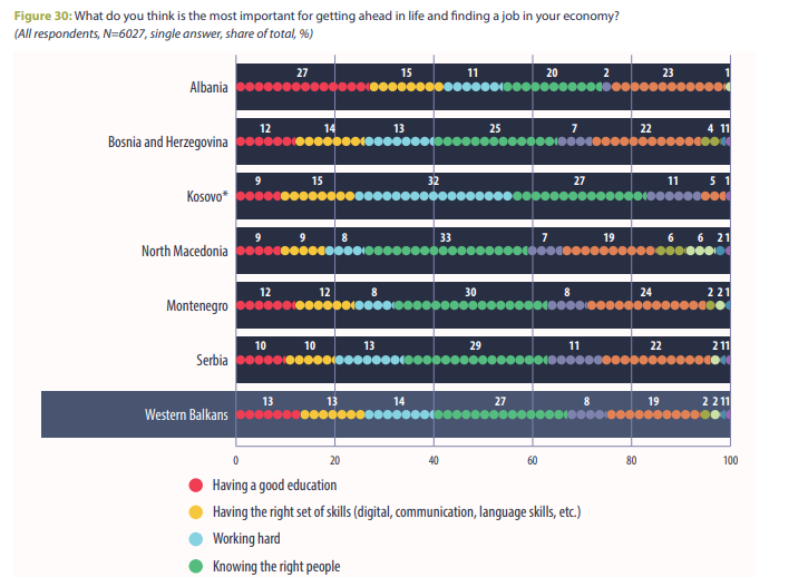 20% e shqiptarëve pranojnë për Barometrin e Ballkanit se çelësi kryesor për të gjetur punë në Shqipëri është “njohja e njerëzve të duhur”. 27% mendojnë se është arsimimi dhe vetëm 15% aftësitë.