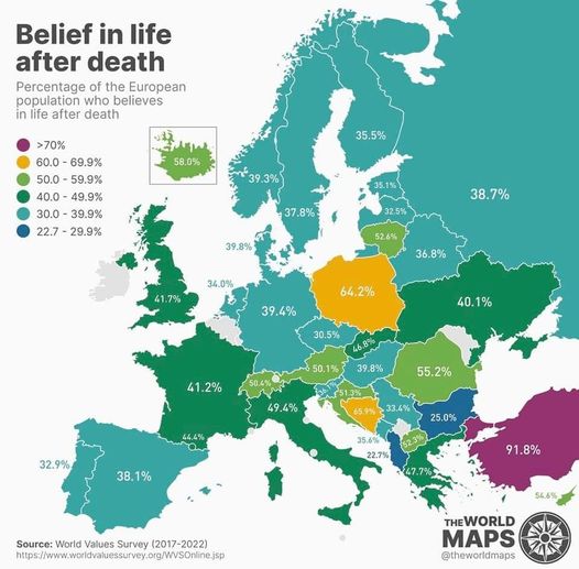 Në vendet europiane, shifrat për besimin e jetës pas vdekjes luhaten nga 40 në 50% të popullsisë. Shifra më e lartë i përket Turqisë, ku 92% e qytetarëve të pyetur besojnë se pas vdekjes ka jetë. Anketa i përket periudhës 2017-2022.