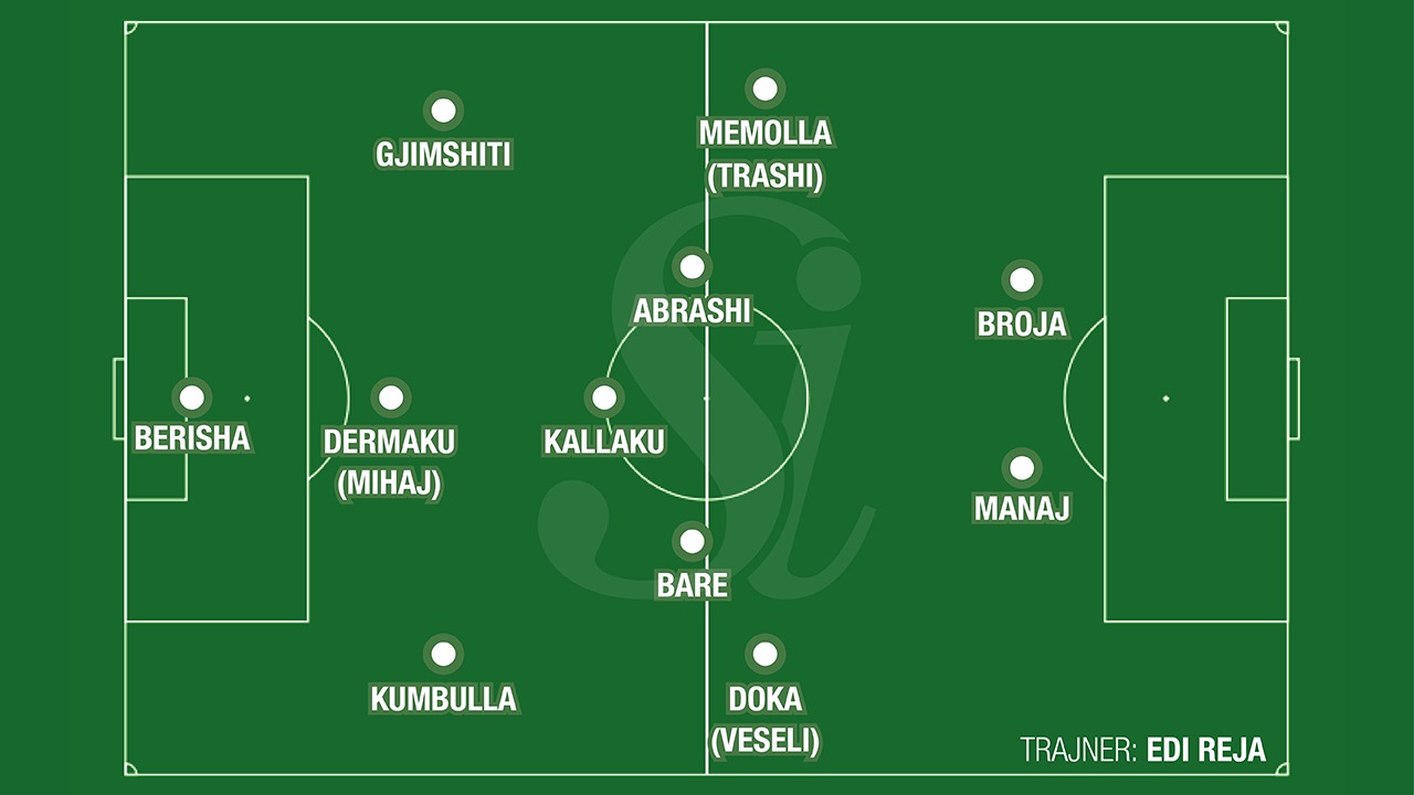 Përpara mund të ketë vend për Marash Kumbullën, djaloshin 19- vjeçar që ka bërë paraqitje të shkëlqyera me Romën në Serinë A. Gjimshiti dhe Dermaku mund të gjejnë sërish vetën në fushën e lojës, për dilema më e madhe e trajnerit italian është t’i japë edhe një shans Enea Mihajt apo jo. Nga krahët, mungesa e Hysajt dhe Uzunit e ka bere gjithçka të vështirë. Frederik Veseli dhe Albi Doka janë testuar si alternativa për linjën e djathtë. Në anën tjetër, Memolla shihet më favorit në krahasim me Trashin.
