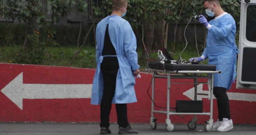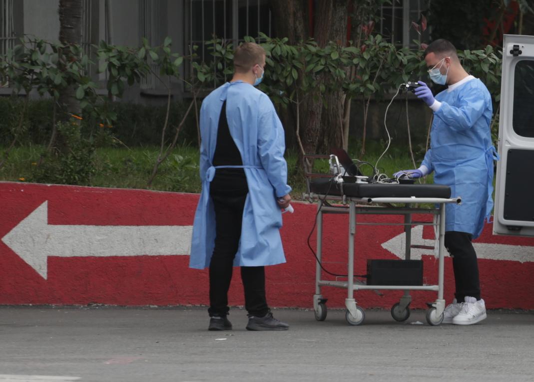 Nën masa të sigurisë anti-Covid dhe të pajisur me kompjutera lëvizës, kjo njësi para derës së Spitalit Infektiv merr aplikimet për pasaporta të reja për pacientët që u ka skaduar ky dokument, e që duan të largohen jashtë Shqipërisë për kurim.