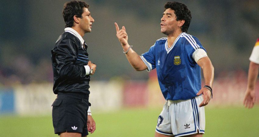 “Duhej ta përjashtoja Maradonën para finales së Botërorit Itali ’90, gjatë himneve kombëtarë, për atë fyerje ndaj tifozëve”. Nuk ka dyshime Edgardo Codesal Mendez, i cili më 8 korrik 1990 arbitroi Argjentinë-Gjermani, akti i fundit i ‘’Itali 90’’, prezent kur Pibe de Oro shau “hijos de puta” italianët që fërshëllenin himnin argjentinas. “Nëse do të aplikoja rregullat, duhet ta nxirrja me të kuq para fillimit të ndeshjes”, ka rrëfyer arbitri për një radio uruguaiane.