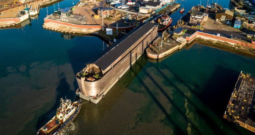 Anija me gjatësi 70 metra, plot skulptura të karaktereve biblike u ndalua pasi u tërhoq përtej Detit të Veriut nga Hollanda.