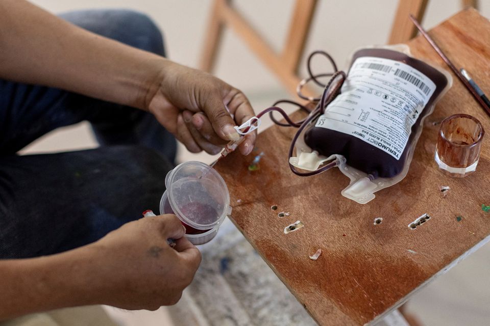 Duke përdorur gjakun e marrë nga venat e tij, 52-vjeçari bën piktura duke tërhequr vëmendjen e të gjithëve për shkak të zgjedhjes së pazakontë.