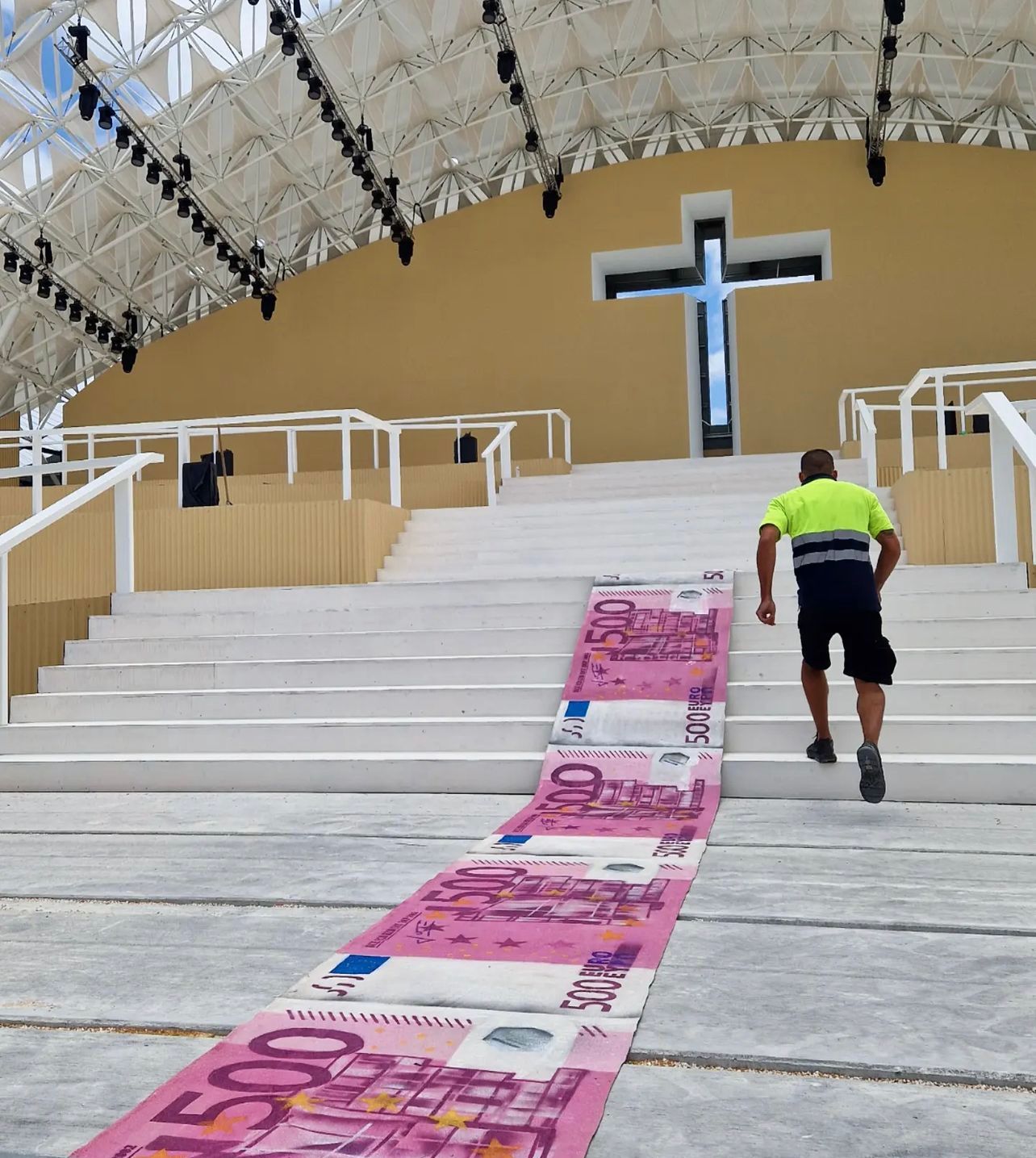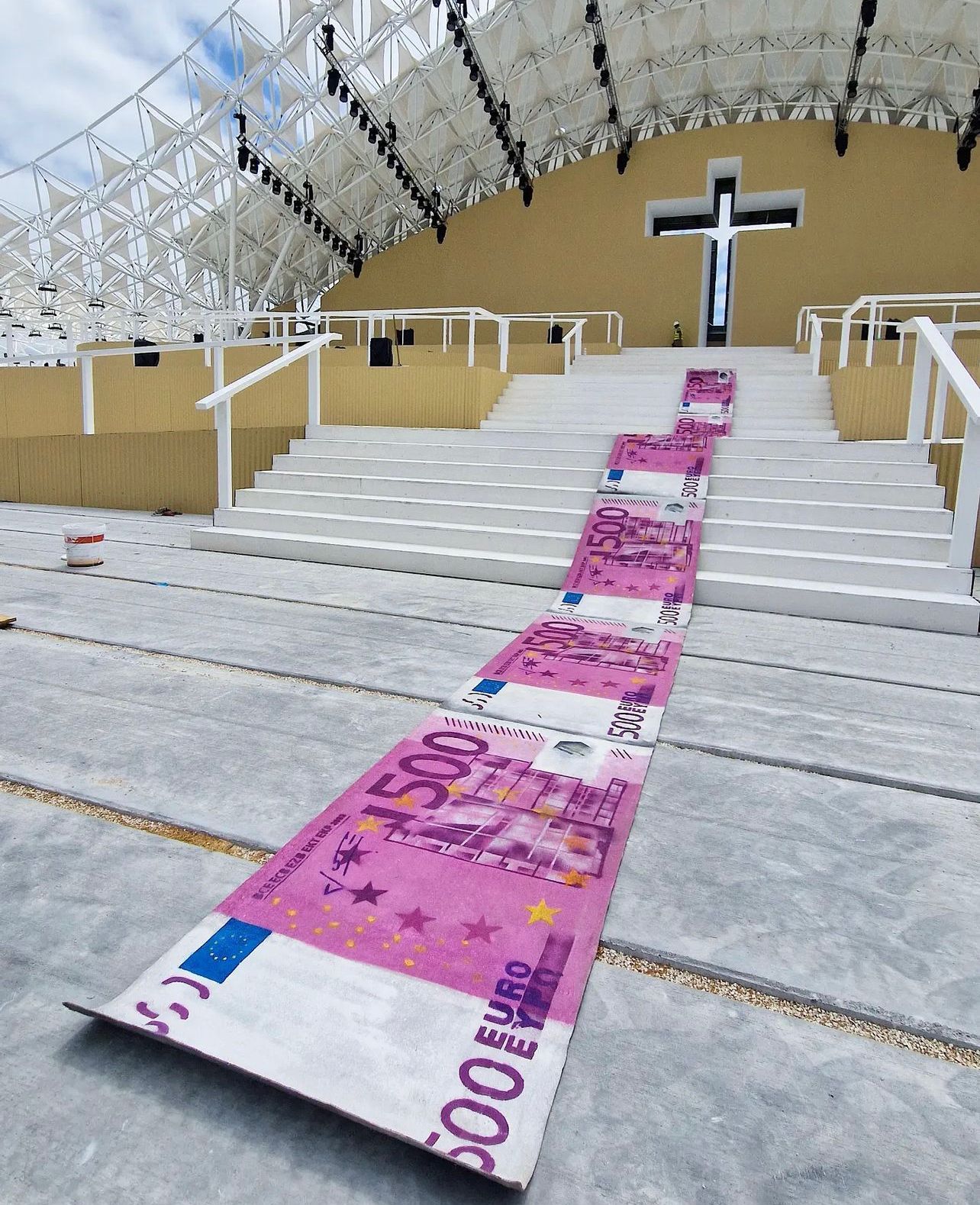 Artisti i famshëm i Portugalisë, Bordalo II, ka hyrë në një ambient të Lisbonës ku Papa Françesku do të kremtojë një meshë javën e ardhshme dhe ka shtrirë një tapet të madh me kartëmonedha për të kritikuar qeverinë se ka shpenzuar shumë për këtë ngjarje.