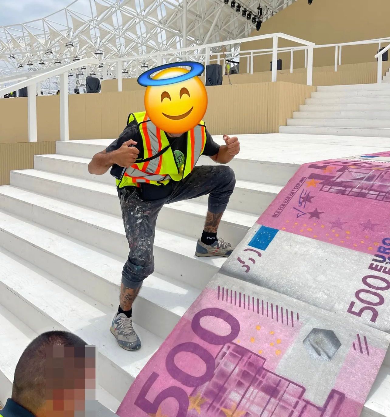 Bordalo II, i njohur për veprat e tij të bëra shpesh nga mbeturinat, ndau fotografi dhe video të tapetit, me kartëmonedha të mëdha prej 500 eurosh, që ai e quan “tapeti i turpit”.