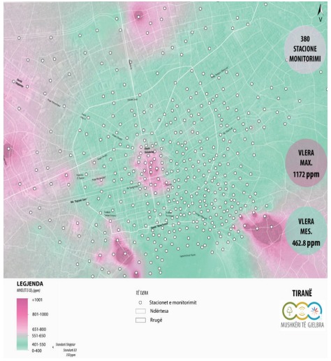 Ndërkohë në tabelën më sipër tregohen zonat ku janë tejkaluar vlerat e lejuara të dyoksidit të karbonit (350 ppm standarti shqiptar, i OBSH dhe BE).