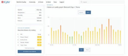 Në tabelën më sipër tregohen nivelet e grimcave të pluhurit PM2.5 për një javë, të regjistruara nga një pajisje që mbledh informacion në kohë reale për ajrin përreth. Kolonat me vijë të kuqe tregojnë pikun e ndotjes në zonën e Bulevardit “Zogu I” gjatë një jave.