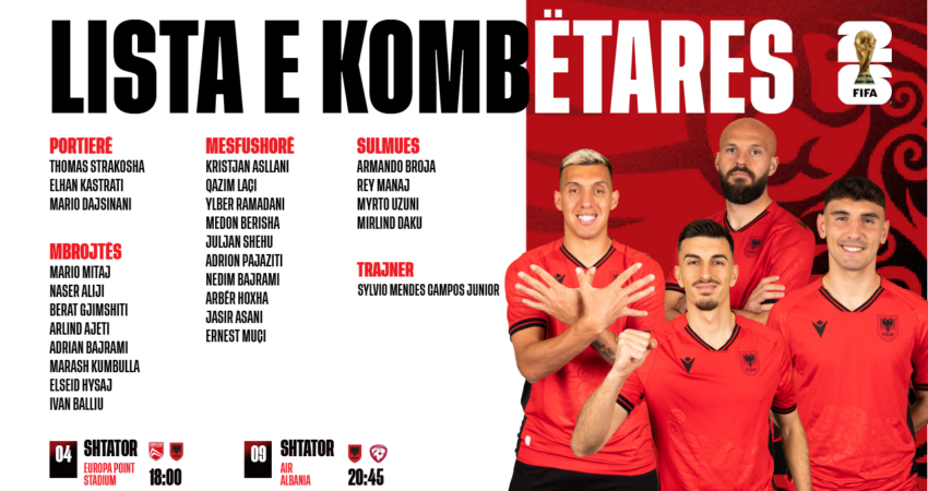 Nga Gazeta Si – Traineri Sylvinho shpalli listën e kuqezinjve për miqësoren ndaj Gjibraltarit ( 4 shtator në stadiumin “Europa Point”, ora 18:00) dhe Letonisë (9 shtator, në stadiumin “Air Albania”, ora 20:45).