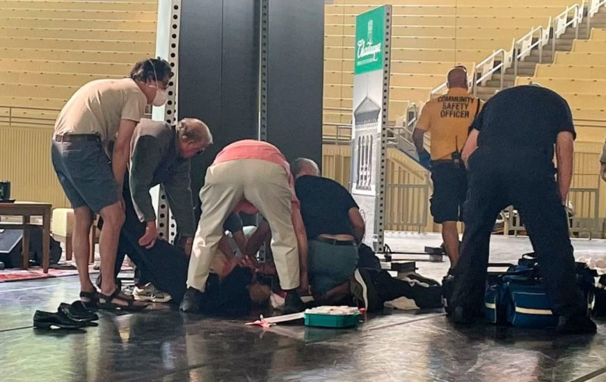 Gazeta Si – Një burrë me bluzë ngjyrë të errët dhe flokë të shkurtër. Këto janë pamjet e para të sulmuesit të Salman Rushdies, i përshkruar nga dëshmitarët si “një furi”, i cili u hodh në skenë i veshur me një maskë të zezë dhe mundi të tërbohej mbi viktimën dhe të luftonte me agjentët.