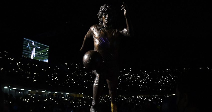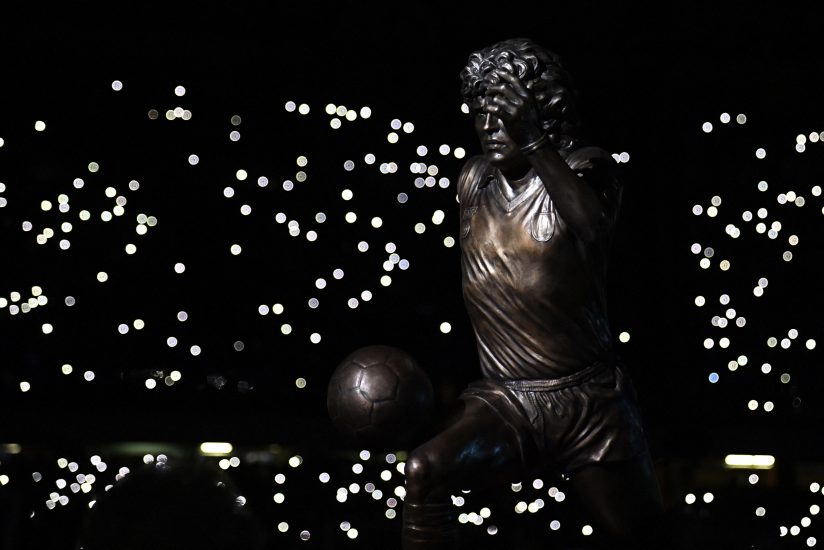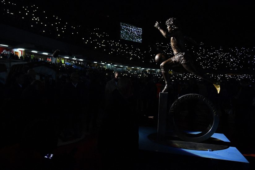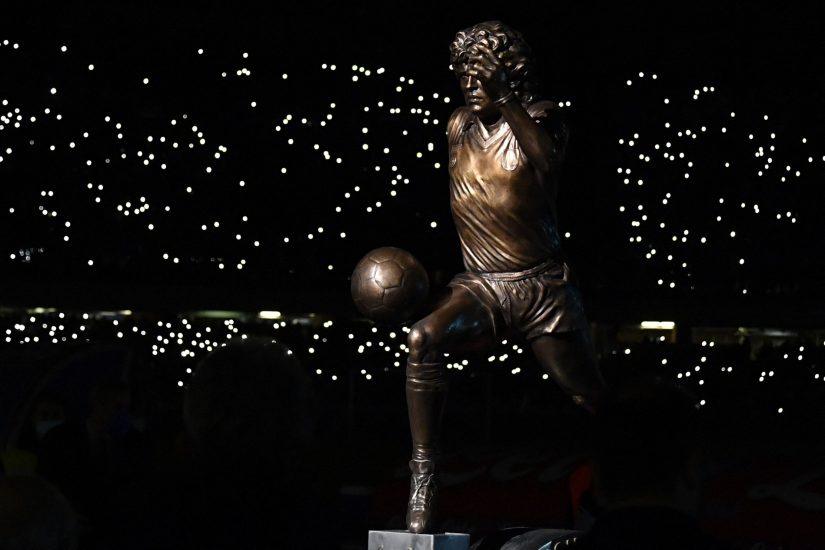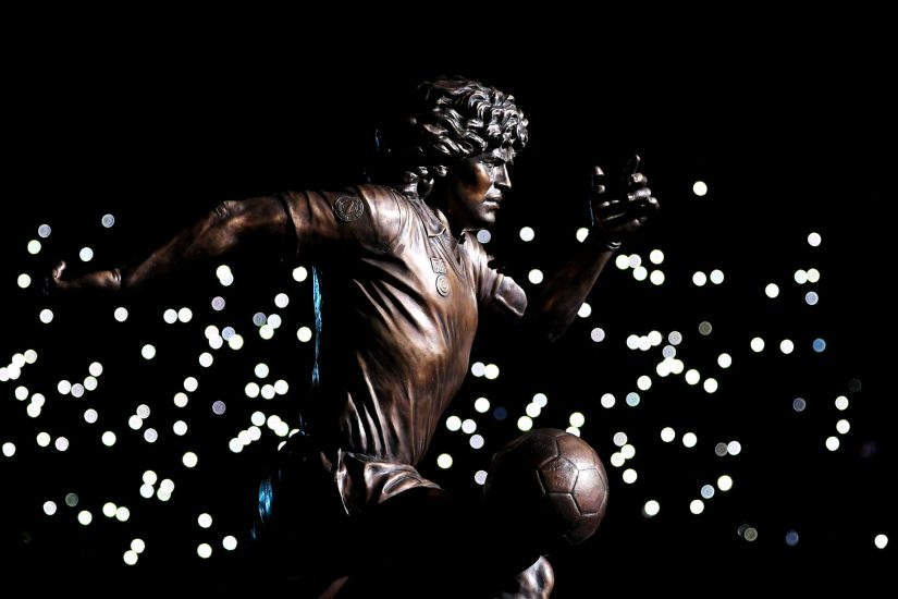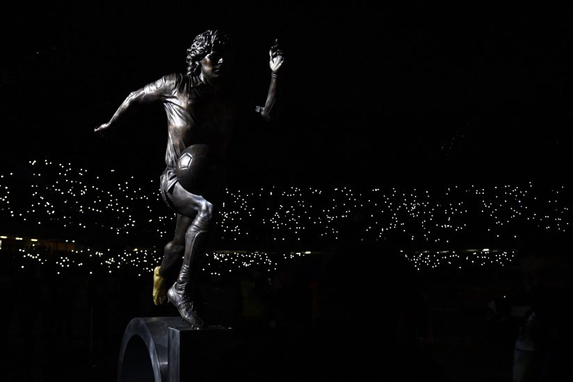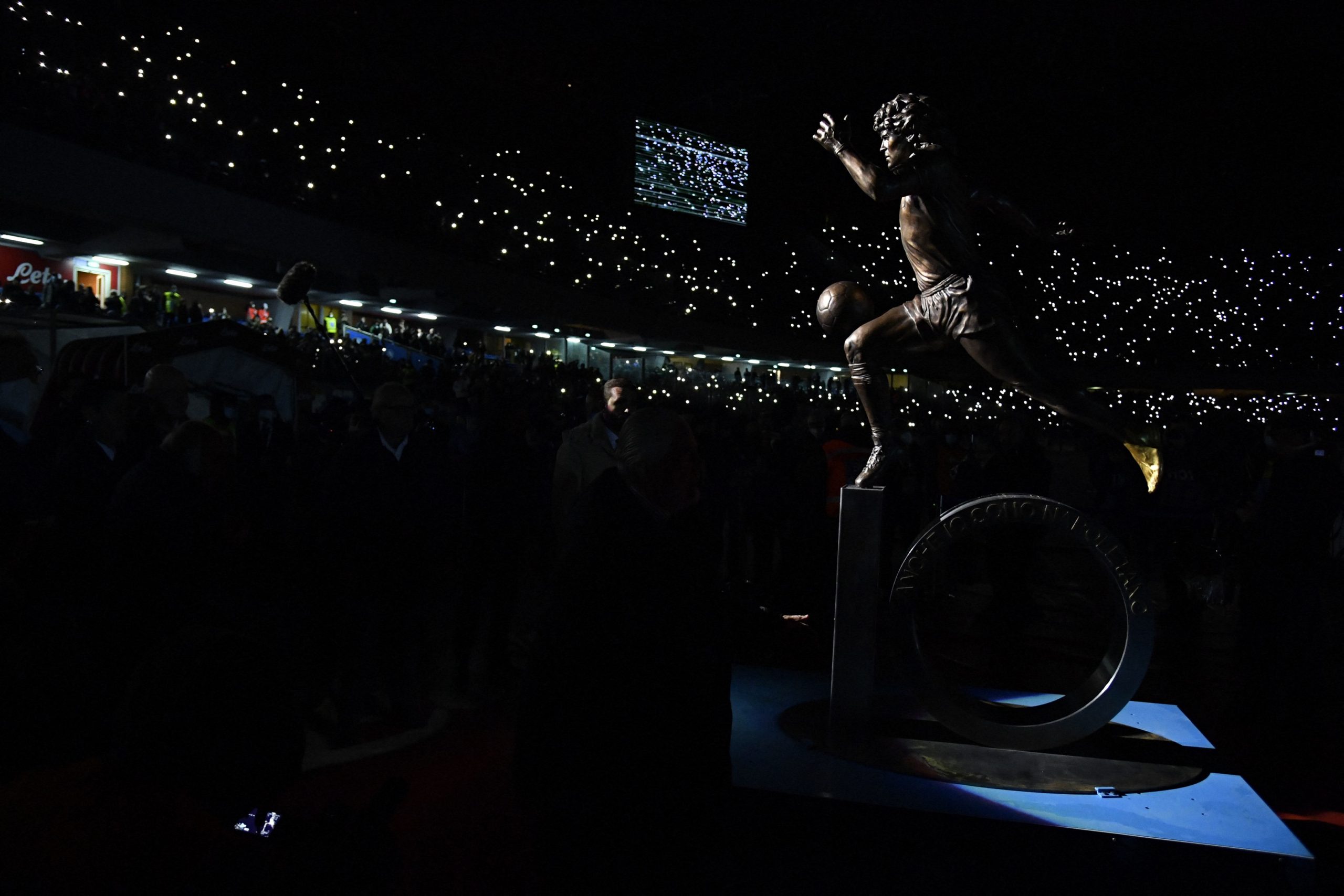 Në stadiumin që tashmë mban emrin e tij, të ndriçuar vetëm nga dritat e celularëve të tifozëve, është zbuluar vepra homazh për Diego Armando Maradonën.