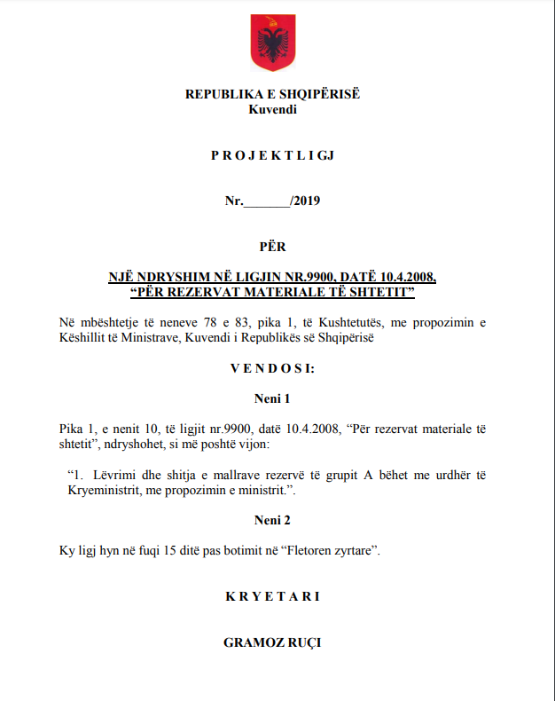 “Sikurse shihet, lëvrimi i mallrave të grupit B dhe C bëhet me anë të një akti individual, “urdhër i ministrit” dhe “urdhër i drejtorit të Përgjithshëm”. Kjo mënyrë e bën më të lehtë e më të shpejtë lëvrimin e mallrave të grupeve përkatëse, sipas kushteve dhe rrethanave të parashikuara ligjërisht. Për shkak se miratimi i lëvrimit të mallrave të grupit A bëhet nëpërmjet një akti kolegjial, si ai i vendimit të Këshillit të Ministrave, kjo sjell vonesa në daljen e aktit të miratimit dhe deri në lëvrimin e tyre. Gjithashtu, ndryshimi i propozuar ka për qëllim unifikimin e procedurës së lëvrimit të mallrave rezervë shteti të secilit grup, nëpërmjet një akti individual hierarkik, duke filluar nga drejtori i Përgjithshëm- ministri dhe Kryeministri”, thuhet në argumentimin e Qeverisë nëpërmjet kësaj nismeje.