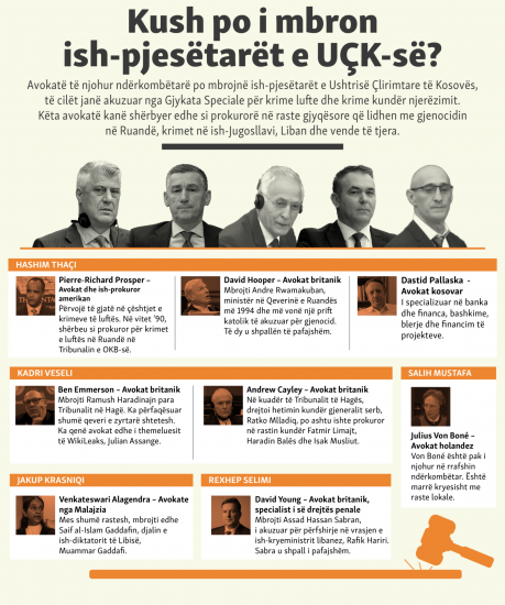Hashim Thaçi, Kadri Veseli, Jakup Krasniqi, Rexhep Selimi e Salih Mustafa, në proceset e tyre gjyqësore do të mbrohen nga juristë që kanë shërbyer edhe si prokurorë dhe që kanë fituar raste të njohura që lidhen me krimet e luftës duke përfshirë gjenocidin në Ruandë, vrasjet në luftërat e hapësirave të ish-Jugosllavisë si dhe krimet lufte të kryera në vende të ndryshme të botës.