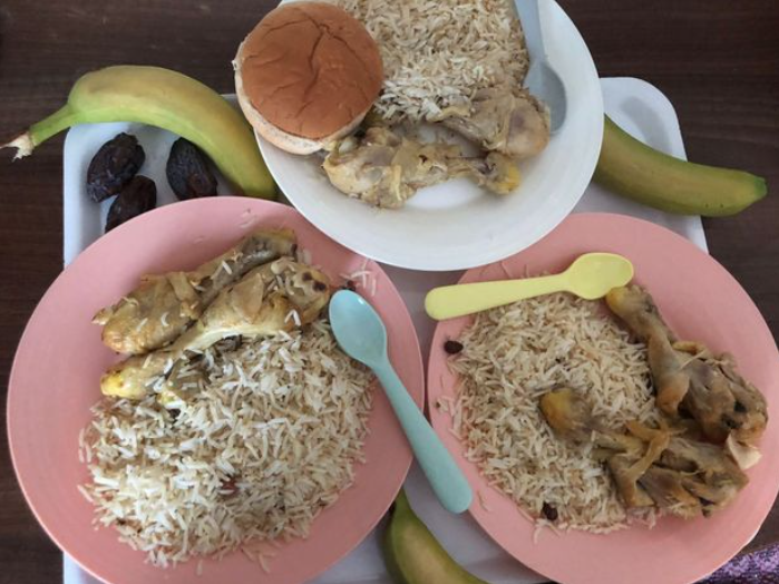 Në fotot e siguruara, duket një vakt me oriz, kofshë pule, banane dhe hurma.