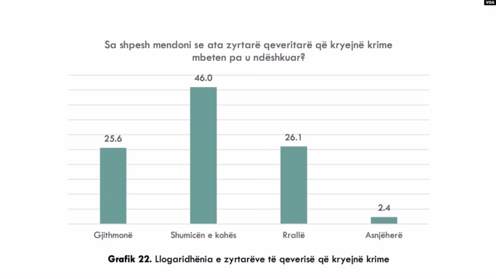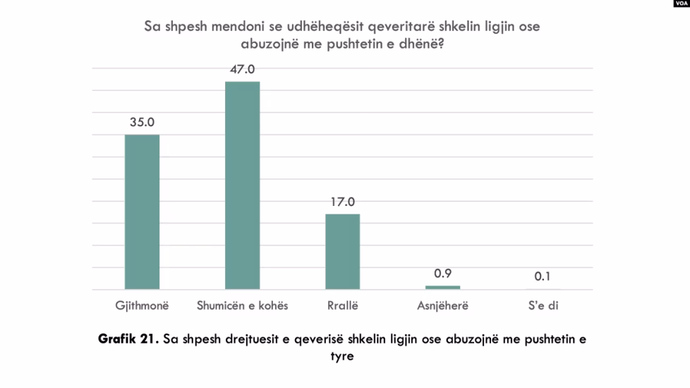 Shumica e të anketuarve, konkretisht 82 për qind e tyre, mendojnë se drejtuesit e qeverisë shkelin ligjin ose abuzojnë me pushtetin, dhe 71.6% e qytetarëve pohuan se krimet e kryera nga zyrtarët e qeverisë mbeten të pandëshkuara.