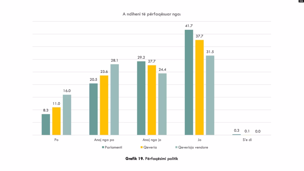 Qytetarët shprehin në anketë një pasiguri të ndjeshme politike, teksa pjesa dërrmuese e të anketuarve pohojnë se nuk ndihen të përfaqësuar nga Kuvendi, qeveria dhe pushteti vendor. Vetëm 8.3% e të anketuarve thanë se ndjehen të përfaqësuar nga parlamenti, 11% e tyre pohuan kështu për pushtetin qendror dhe 16% të tjerë ndjehen të përfaqësuar në qeverisjen vendore.