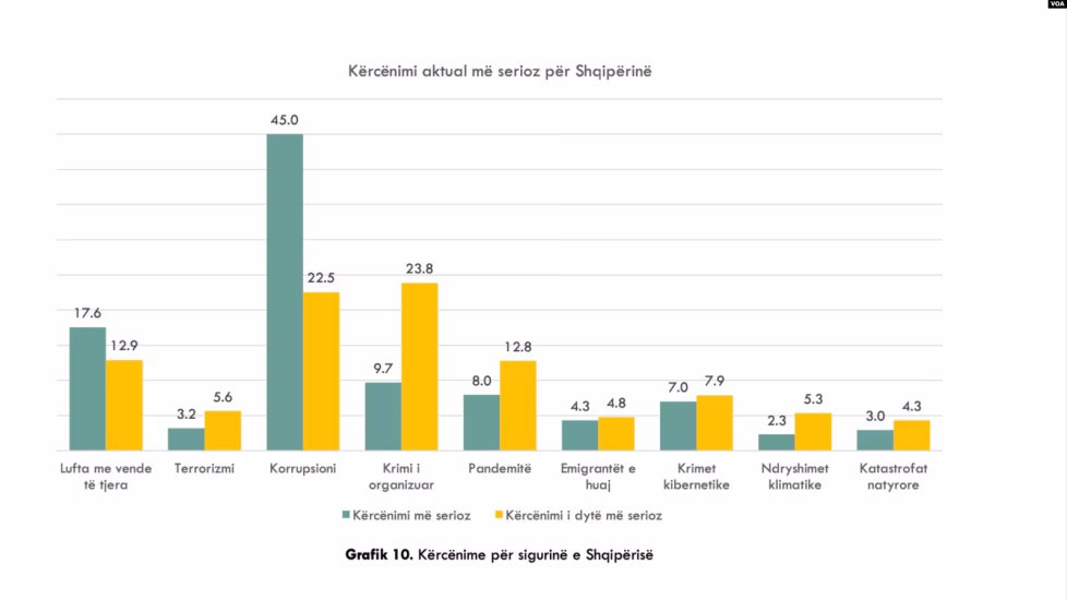 Në studim thuhet se nga viti në vit është rritur numri i qytetarëve që e nënvizojnë korrupsionin si kërcënimin më serioz të sigurisë. Në vitin 2024 është 45 për qind, në vitin 2022 ishte 39 për qind, ndërsa në vitin 2020 ishte 37 për qind. Këtë vit, afro 22.5 për qind e të anketuarve e cilësojnë korrupsionin si kërcënimin e dytë më të madh për sigurinë.
