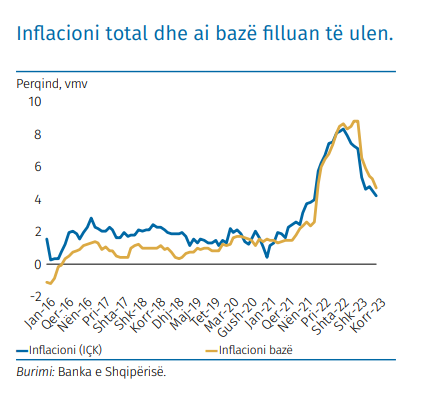 Ushqimet e papërpunuara ishin kontribuuesi më i madh i rritjes së inflacionit, të shoqëruara nga rritja e çmimeve të shërbimeve. Duke reflektuar presionet e kërkesës, inflacioni bazë ishte mesatarisht 5.5% në tremujorin e dytë 2023, duke shënuar rënie krahasuar me tremujorin e parë 2023. Në të kundërt, inflacioni jobazë arriti në 2.8% në tremujorin e dytë, dhe është duke u kthyer gradualisht në nivelin mesatar të paraluftës.
