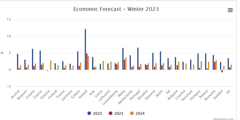 Eurozona do të shmangë recesionin teknik që Komisioni priste tre muaj më parë, pasi rritja në tre muajt e fundit të 2022 ishte 0.1% nga një tremujor në tjetrin, ndërkohë që Komisioni Europian parashikon një shifër 0% në tre muajt e parë të 2023.