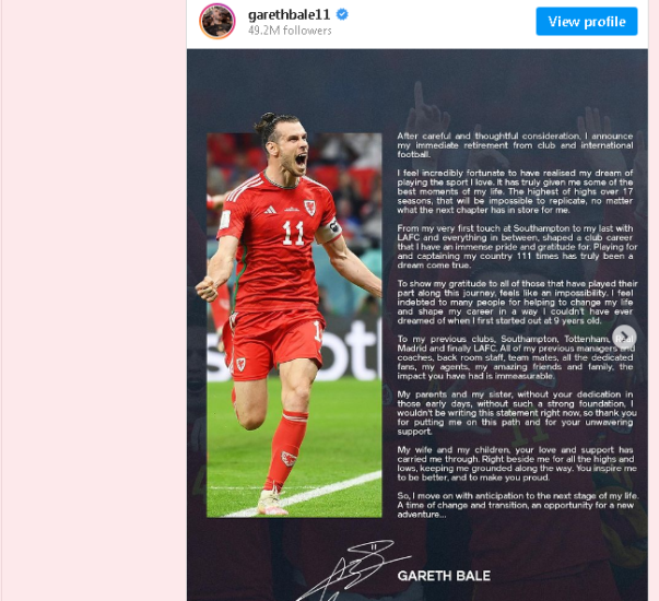Gazeta Si – Gereth Bejl i jap lamtumirën futbollit të luajtur. Futbollisti uellsian ka dhënë lajmin e tërheqjes nëpërmjet rrjeteve sociale. Një vendim i papritur, që vjen një vit pas transferimit në SHBA, ku fitoi titullin me Los Anxheles. Ish-lojtari i Totenhemit dhe Real Madridit var ‘këpucët në gozhdë’.
