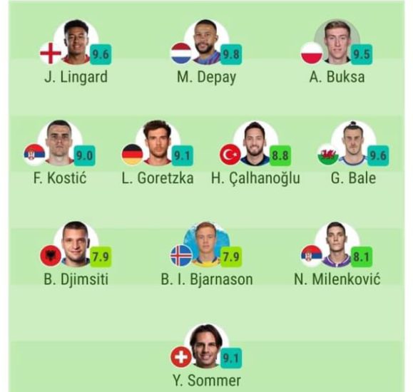 Pjesa tjetër e formacionit të përzgjedhur nga SofaScore kompletohet me Bejl, Goretzka, Çalhanoglu dhe Kostiç në mesfushë, ndërsa në sulm është treshja e përbërë nga Lingard i Anglisë, Depai i Holandës dhe Buksa i Polonisë, i cili realizoi edhe në portën e Berishës në Varshavë.