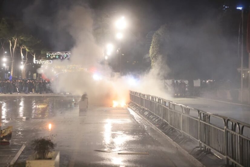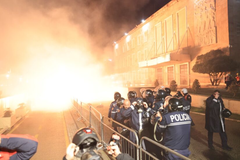 Njësoj si në protestat paraardhëse, pas mbarimit të fjalimit të kryedemokratit Sali Berisha, protestuesit kanë filluar të hedhin molotov dhe fishekzjarre drejt Kryeministrisë.