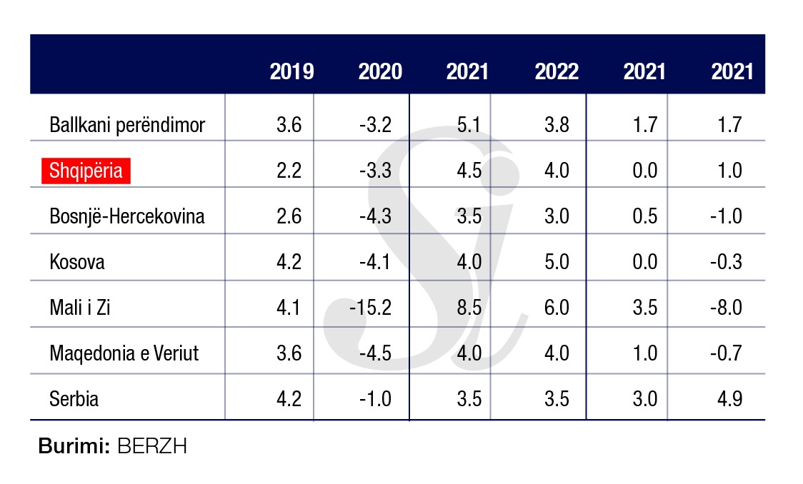 Për 2022, BERZH pret zgjerim te mëtejshëm me 3.9% rritje, ndërsa për Shqipërinë parashikon një rritje 4% vitin që vjen. Tkurrja e prodhimit në vitin 2020 ishte me e butë sesa ishte parashikuar me parë pas përmirësimeve ne mjedisin e përgjithshëm ekonomik në fund të vitit të kaluar për shkak të eksporteve të forta dhe mbështetjes fiskale.