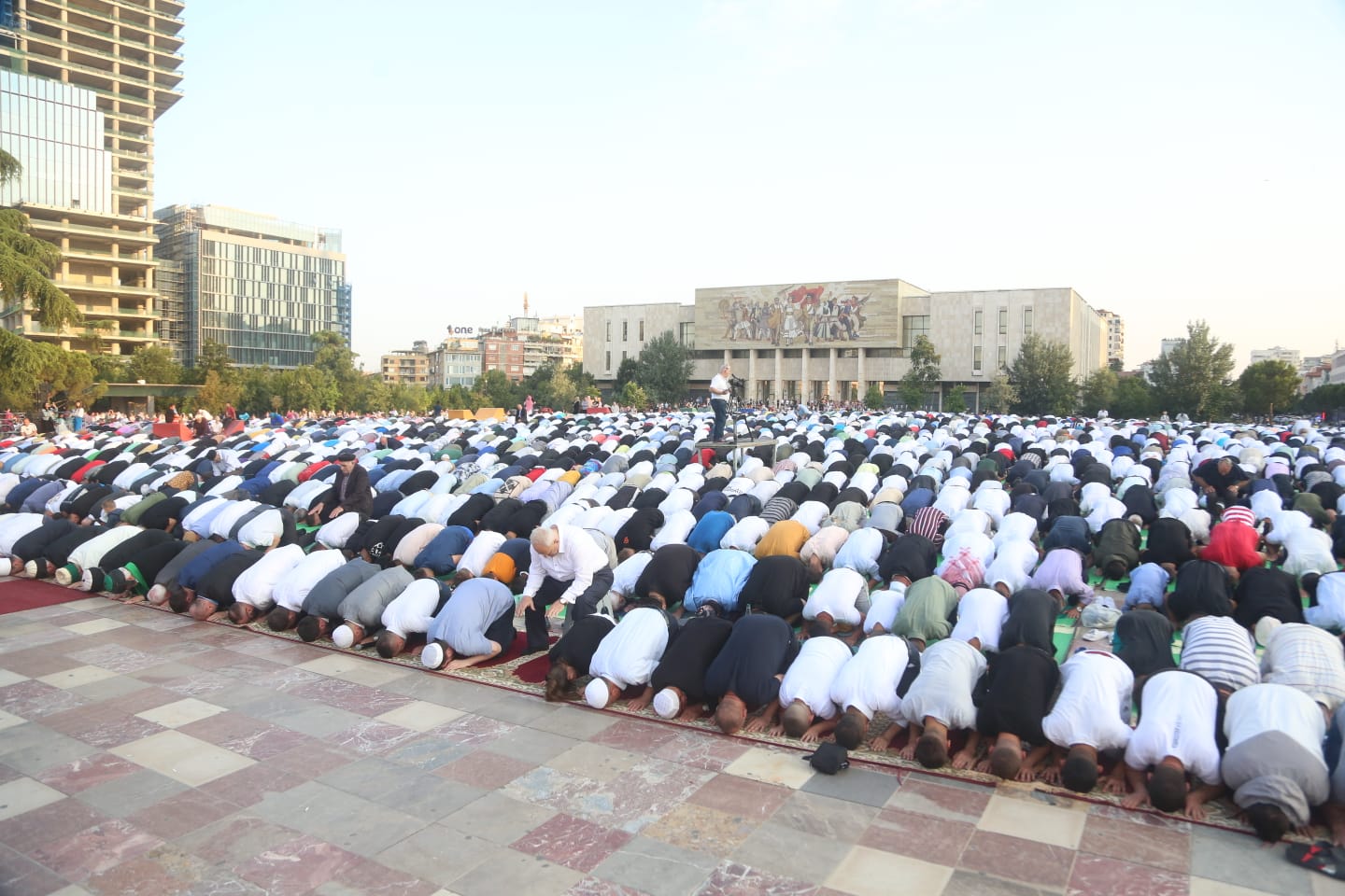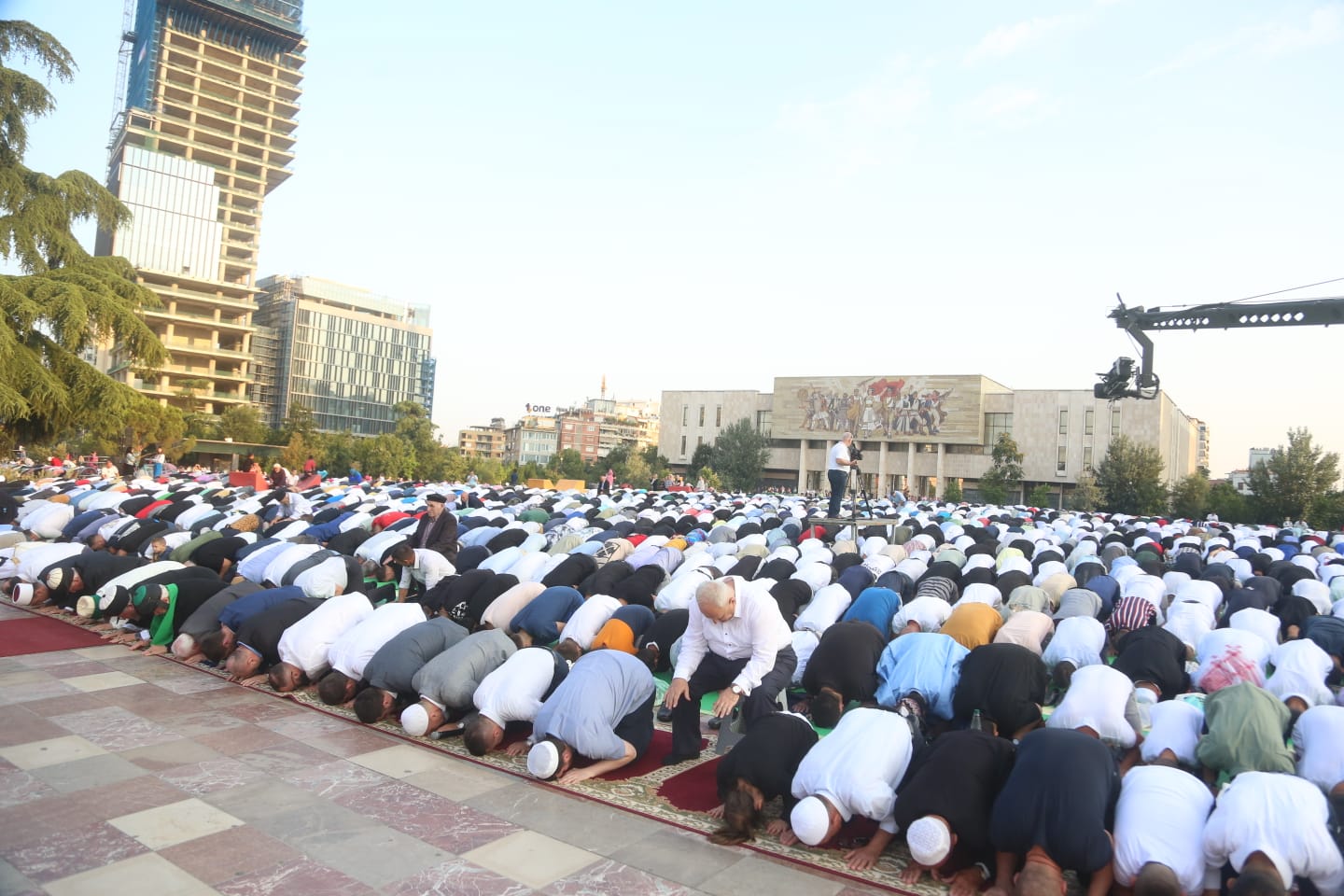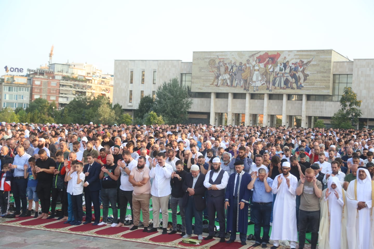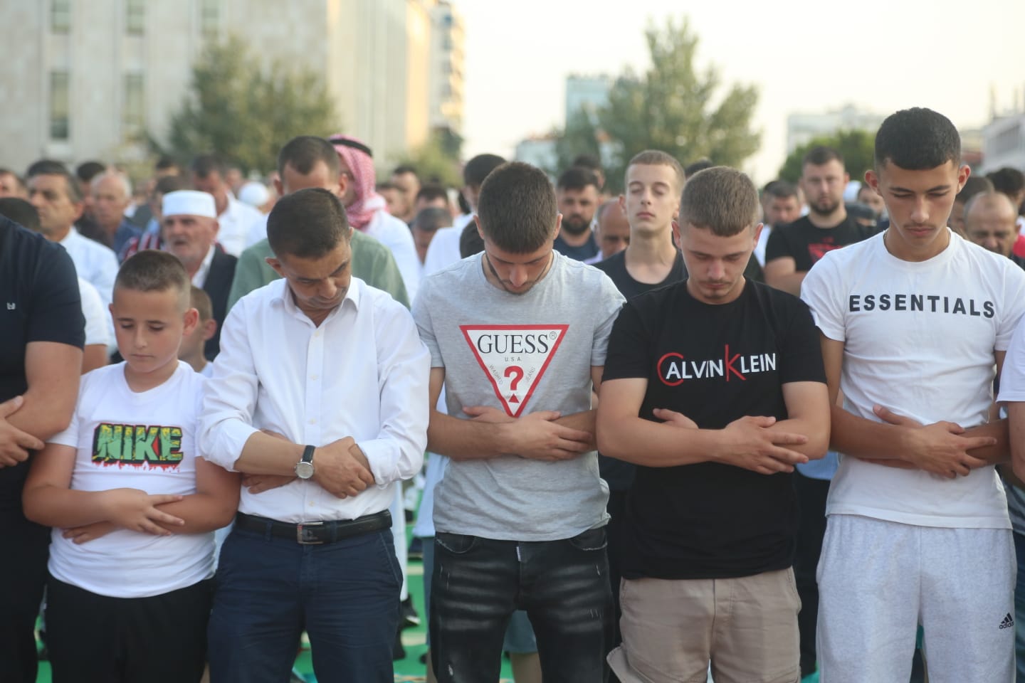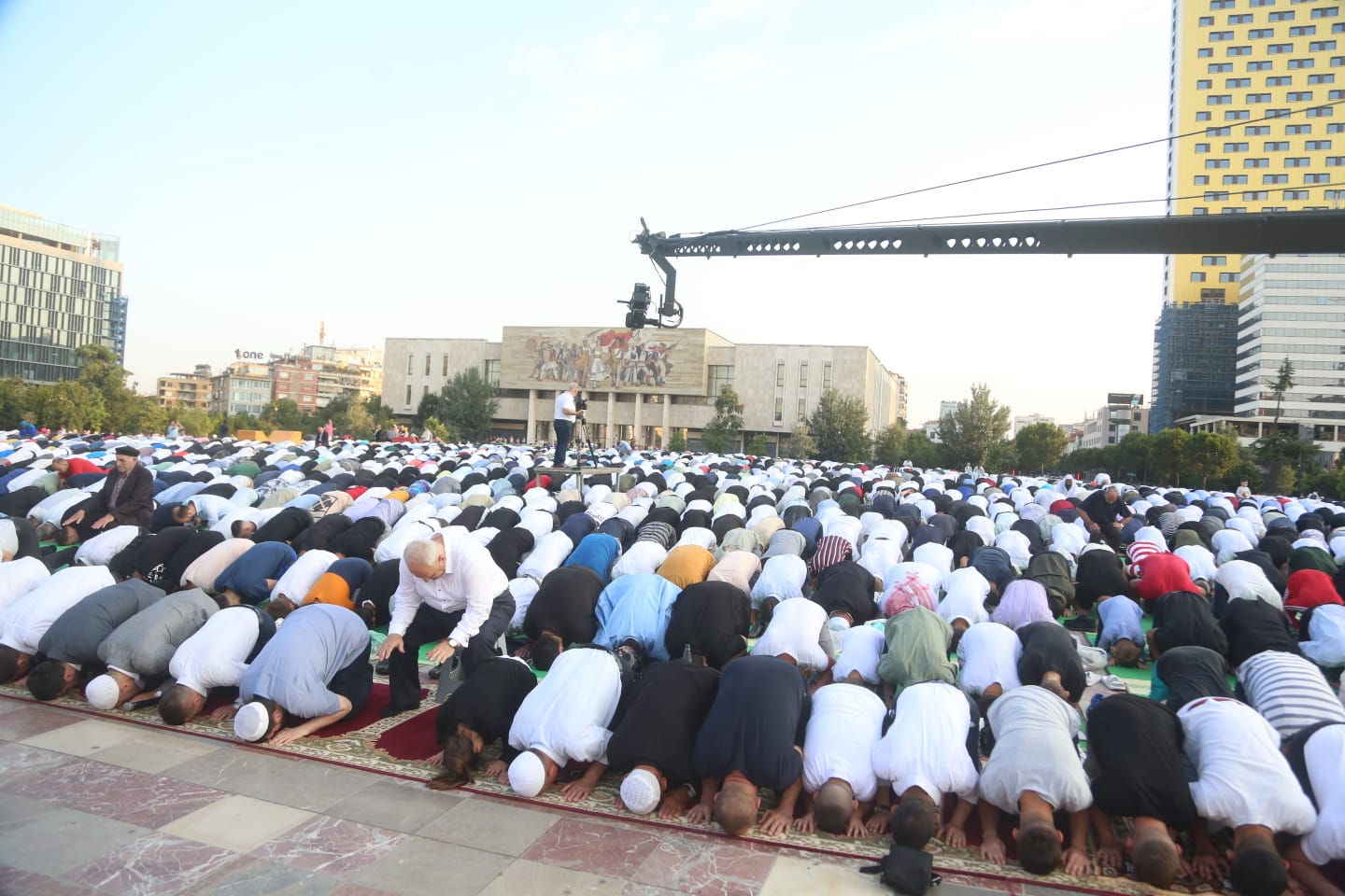 Mijëra besimtarë myslimanë u mblodhën këtë të mërkurë në mëngjes në sheshin ‘Skënderbej’ për faljen e namazit të Kurban Bajramit. Falja nisi në orën 06:00.