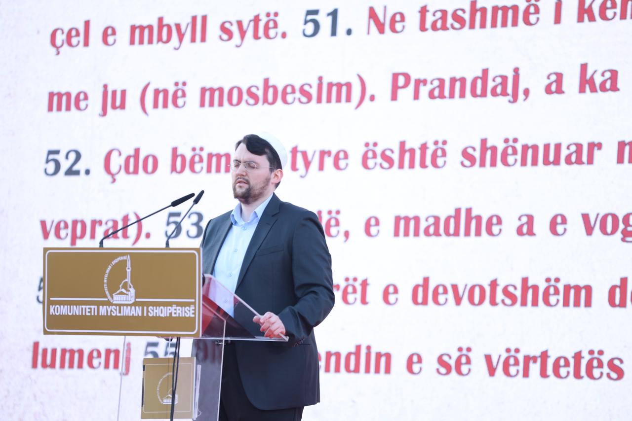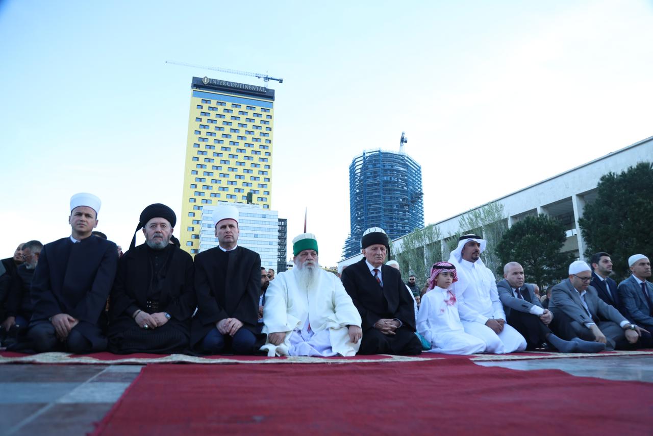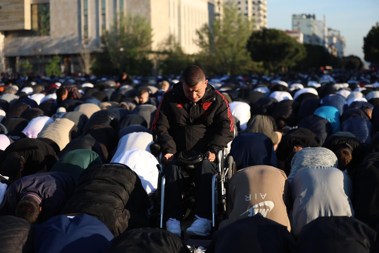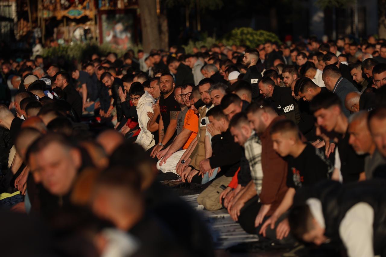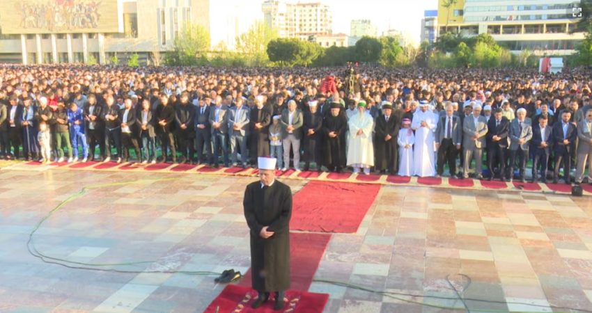 Pas një muaji agjërimi, besimtarët myslimanë kremtojnë sot festën. Mijëra prej tyre falën namazin në sheshin “Skënderbej”, nga ku kreu i Komunitetit Mysliman Bujar Spahiu u bëri thirrje të rinjve të mos e braktisin vendin.