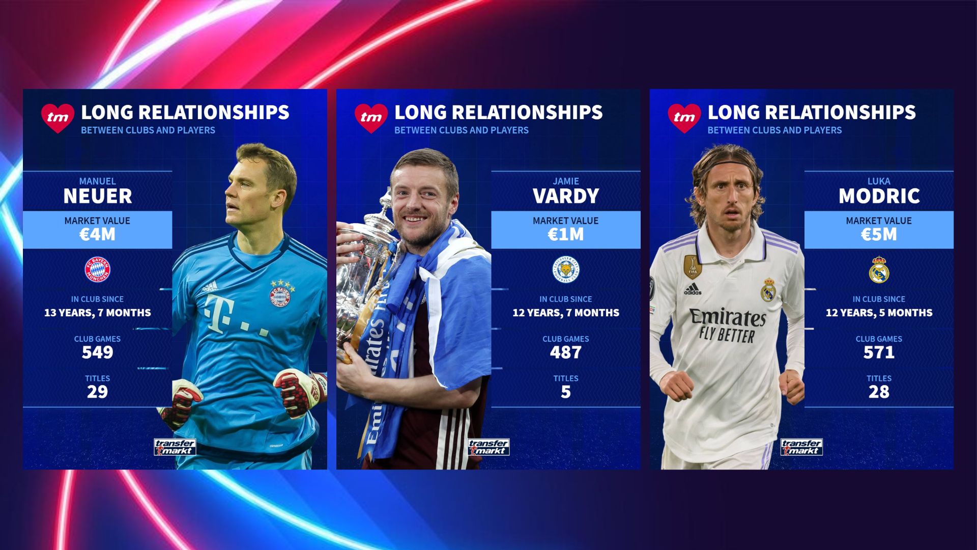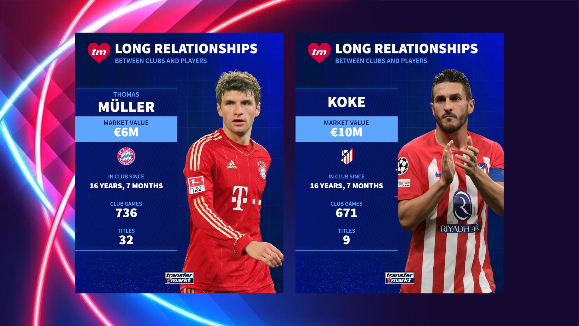 Dy të parët janë Thomas Muller (Bayern) dhe Jorge Resurrección Merodio i njohur si Koke (Atletico Madrid). 16 vite e 7 muaj në skuadrat përkatëse dhe me një vlerë financiare minimale aktuale, 6 milionë euro kushton gjermani, 4 më shumë spanjolli. 32 tituj në 736 ndeshje për Muller dhe vetëm 9 në 671 për Koke. Kontratat e tyre skadojnë në fundin e këtij sezoni por lojtarët nuk e fshehin dëshirën për të vazhduar. “Quintet-in” e jetëgjatëve në një skuadër e plotësojnë Manuel Neuer (Bayern), Jamie Vardy (Leicester City) dhe Luka Modric (Real Madrid). Portieri gjerman luan prej 13 vitesh e 7 muajsh në Mynih (u transferua nga Schalke 04) dhe së fundi rinovoi deri në Qershor 2026.