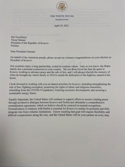 Presidenti Biden e ka shprehur këtë qëndrim në një letër dërguar Presidentes së Kosovës, Vjosa Osmani, përmes së cilës e uron për zgjedhjen e saj në këtë pozitë