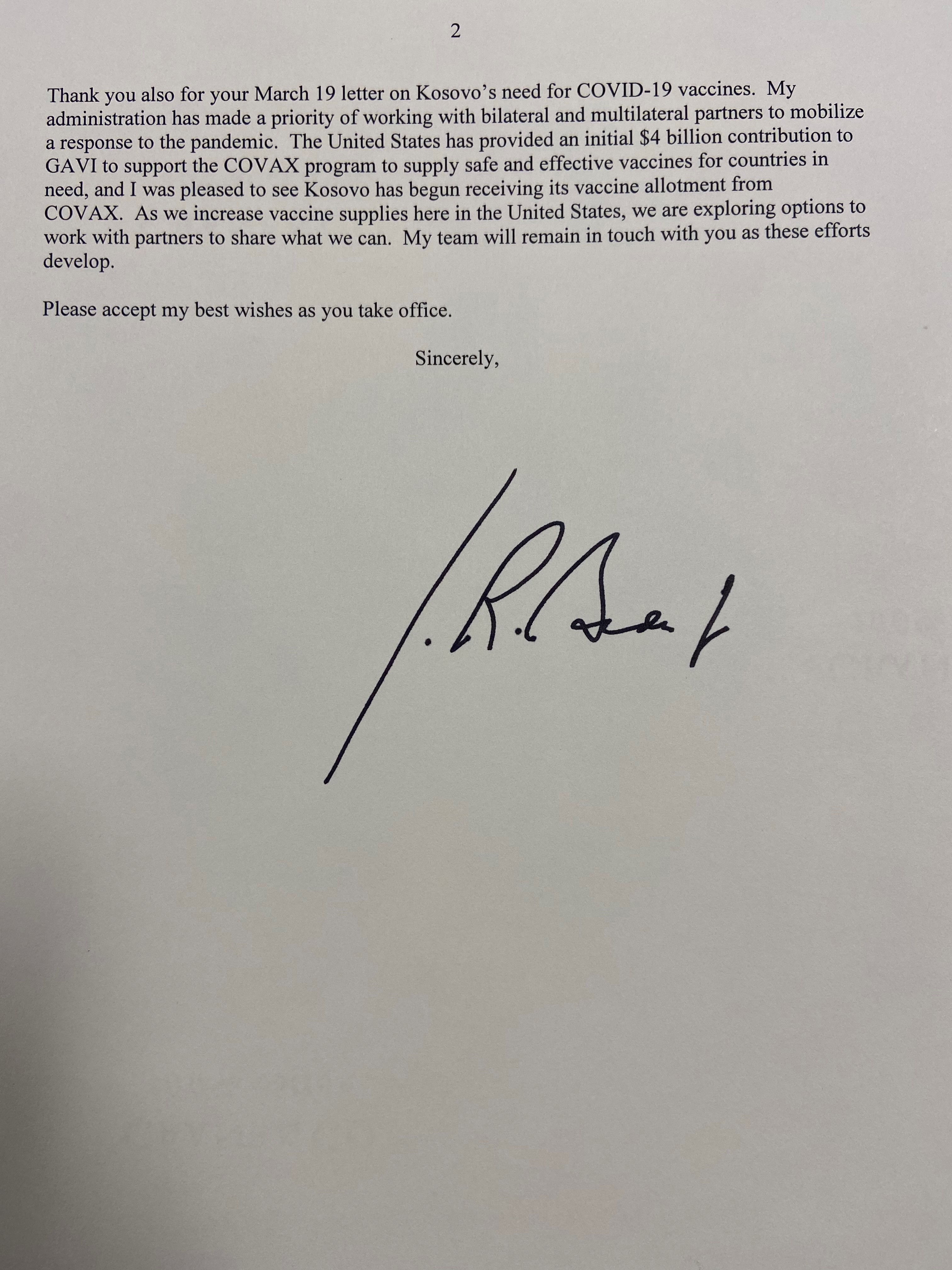 “Administrata ime ka vënë ndër prioritetet bashkëpunimin dypalësh dhe shumëpalësh për të gjetur përgjigje për pandeminë. Shtetet e Bashkuara kanë dhënë një kontribut fillestar prej 4 miliardë dollarësh për GAVI për të mbështetur programin e COVAX për furnizim me vaksina të sigurta dhe efektive të vendeve në nevojë dhe mua më erdhi mirë kur mësova se Kosova ka filluar të marrë vaksinat e siguruara nga COVAX. Me rritjen e furnizimeve me vaksina këtu në Shtetet e Bashkuara, ne do të shqyrtojmë mundësitë e bashkëpunimit me partnerë tanë për të ndarë sasitë që mundemi. Ekipi im do të jetë në kontakt me ju për të çuar përpara këto përpjekje”, thuhet në letrën e Presidentit Biden.