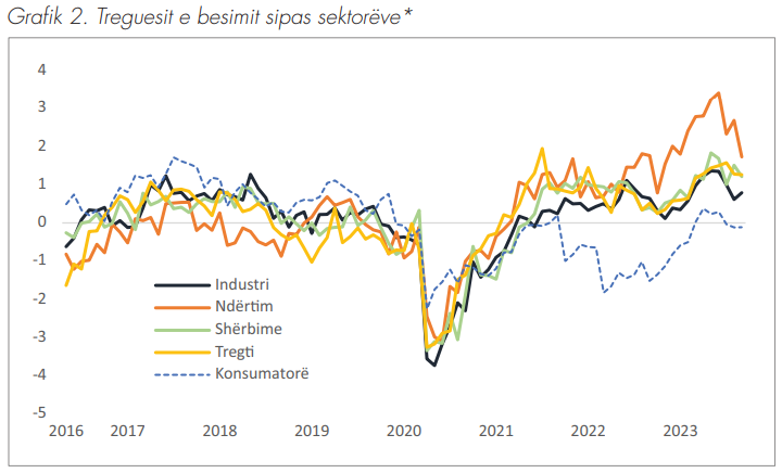 Të vetmet biznese që rezultuan optimiste gjatë shtatorit ishin ato të industrisë, besimi i të cilëve u rrit me 2.3 pp. Në rritjen e këtij treguesi ka ndikuar rritja e kërkesës në vend dhe eksporte si edhe niveli i prodhimit. Gjithashtu, pritjet e bizneseve të industrisë për prodhimin në të ardhmen kanë regjistruar rritje në shtator, ndërsa pritjet për punësimin dhe çmimet janë në rënie.