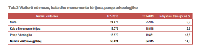 Numri i vizitorëve gjithsej në muze, kala dhe parqe arkeologjike në tremujorin e parë 2019 ka qenë 64.315 vizitorë. Nga totali i vizitorëve në institucionet e trashëgimisë kulturore 25.916 kanë qenë vizitorë në muze, 18.518 vizitorë në kala e monumente të tjera, dhe 19.881 vizitorë janë në parqe arkeologjike.
