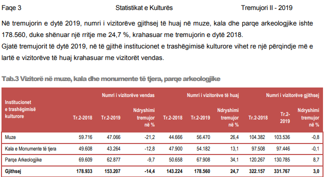 Ndërsa në tremujorin e dytë të vitit 2019, numri i vizitorëve gjithsej në muze, kala dhe parqe arkeologjike ka qenë 331.767 vizitorë. Nga totali i vizitorëve në institucionet e trashëgimisë kulturore, 103.536 kanë qenë vizitorë në muze, 97.446 vizitorë në kala e monumente të tjera dhe 130.785 kanë qenë vizitorë në parqe arkeologjike.