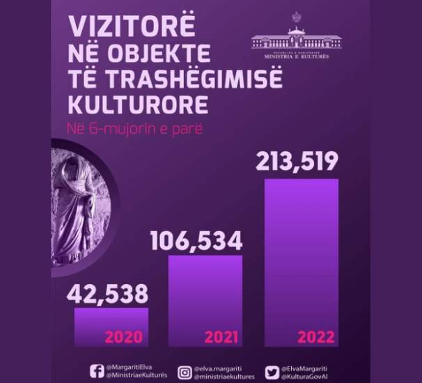 “Në 6-mujorin e parë të këtij viti, numri i vizitorëve në objekte të trashëgimisë kulturore ka qenë dy herë më shumë se në vitin 2021!”, shkruan ministrja Margariti për vizitueshmërinë, ndërsa shton se “monumentet tona po bëhen gjithnjë e më ftuese për vizitorët!”.