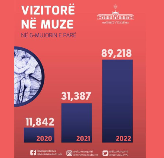 “Statistikat e gjashtëmujorit të parë janë optimiste sa i takon numrit të vizitorëve. Krahasuar me një vit më parë, shumë më shumë vizitorë kanë shijuar pasuritë e muzeve tanë’, shkruan Margariti bashkangjitur fotos ku bën publik numrin e vizitorëve në muze (89.218 vizitorë në 6-mujorin e parë të 2022).