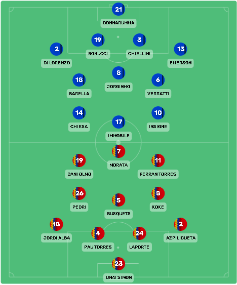 Pika e dobët e spanjollëve është mbrojtja, ku Enrike rreshton katërshen e përbërë nga Laporte dhe Pau Lopez në qendër, Zhordi Alba në të majtë dhe Azpilikueta në të djathtë. Në mesfushë do të jetë sërish nga minuta e parë treshja Buskets-Pedri-Koke. Ndeshjen e sotme e arbitron gjermani Feliks Brysh.