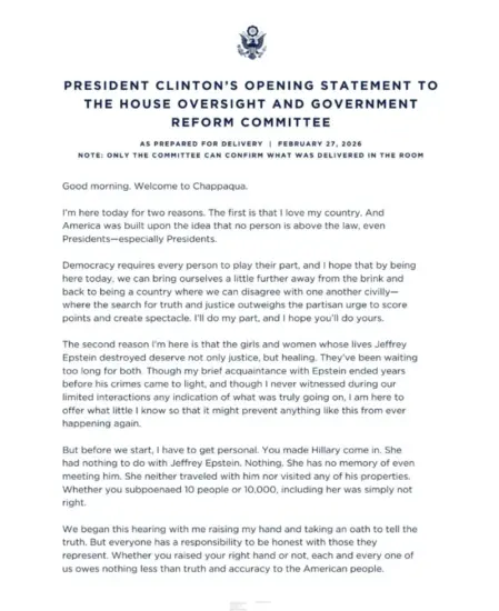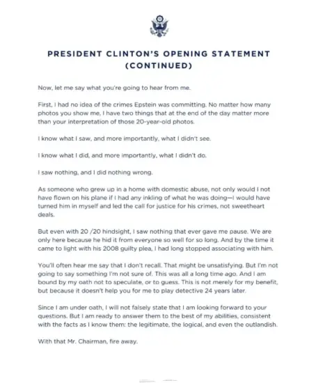 Ish-Presidenti tha se kishte pasur vetëm një “njohje të shkurtër me Epstein” që përfundoi “vite para se krimet e tij të dilnin në dritë” dhe se ai kurrë nuk e pa “çfarë po ndodhte vërtet” me të ndjerin e dënuar për abuzim seksual, sipas deklaratës së tij hapëse para ligjvënësve.
