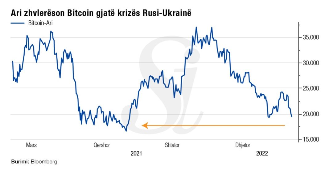 Bitcoin ra në nivelin e 40 mijë gjatë fundjavës dhe vazhdoi të zhytej më tepër me thellimin e krizës në Ukrainë duke kundërshtuar argumentin se kriptomonedhat janë parajsë në një rrëmujë gjeopolitike. Në të njëjtën kohë, ari ka arritur nivelin më të lartë që nga qershori 2021.