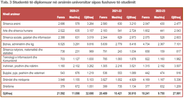 Sipas të dhënave të publikuara nga Instat, fusha në të cilën janë diplomuar më shumë studentë në të gjitha programet është “Biznes, administrim dhe ligj” prej 25,4 % ose një e katërta e numrit të përgjithshëm të të diplomuarve, si për femrat dhe për meshkujt.